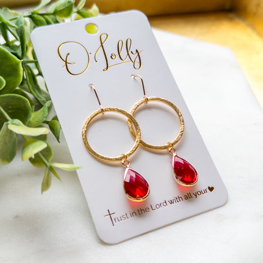Gold Hoop w/Red Teardrop Dangle - Rosy