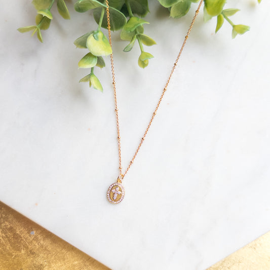 18K Gold Plated Beaded Chain w/Gold Oval Rhinestone Cross Charm Necklace