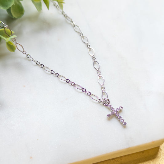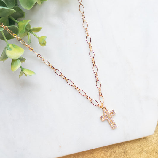 Gold Open Rhinestone Cross Necklace w/18K Gold Plated Oval Chain