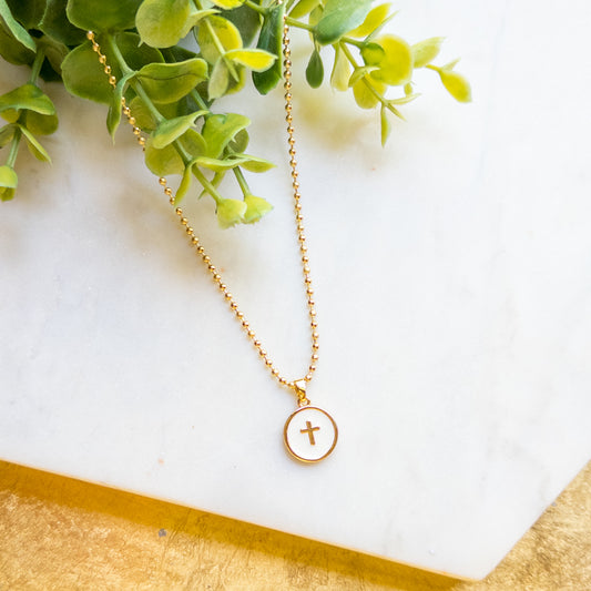 18K Gold Plated Necklace w/White Disc & Gold Cross