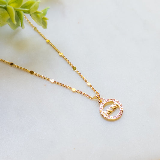 18K Gold Chain w/MOM Circle Pendant Necklace