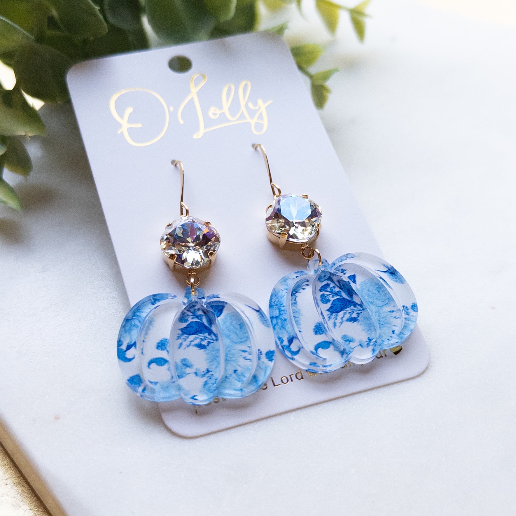 Blue & White Pumpkin Earrings w/Clear ML Stone
