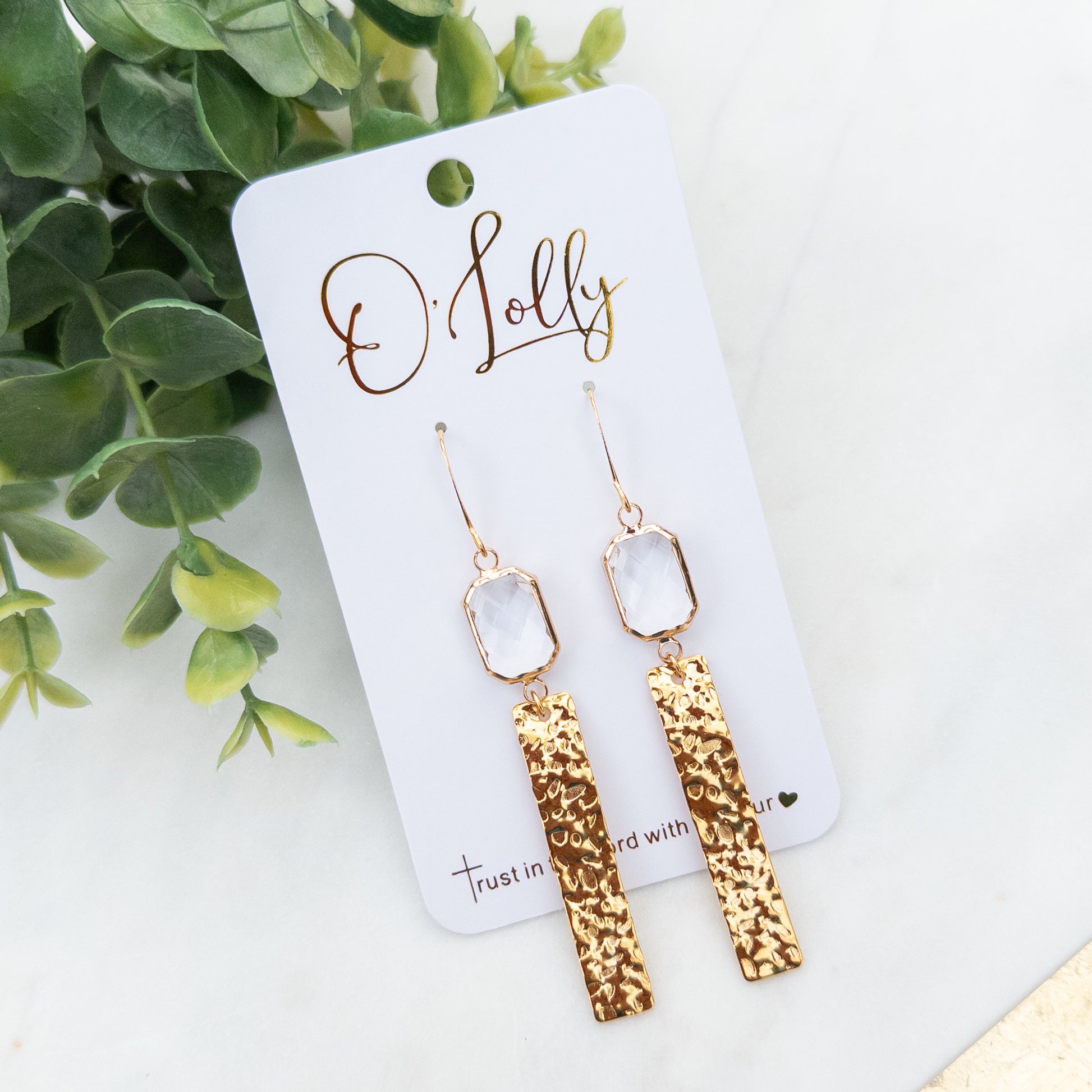 Gold Textured Bar w/Clear Glass Earrings “Isabel”