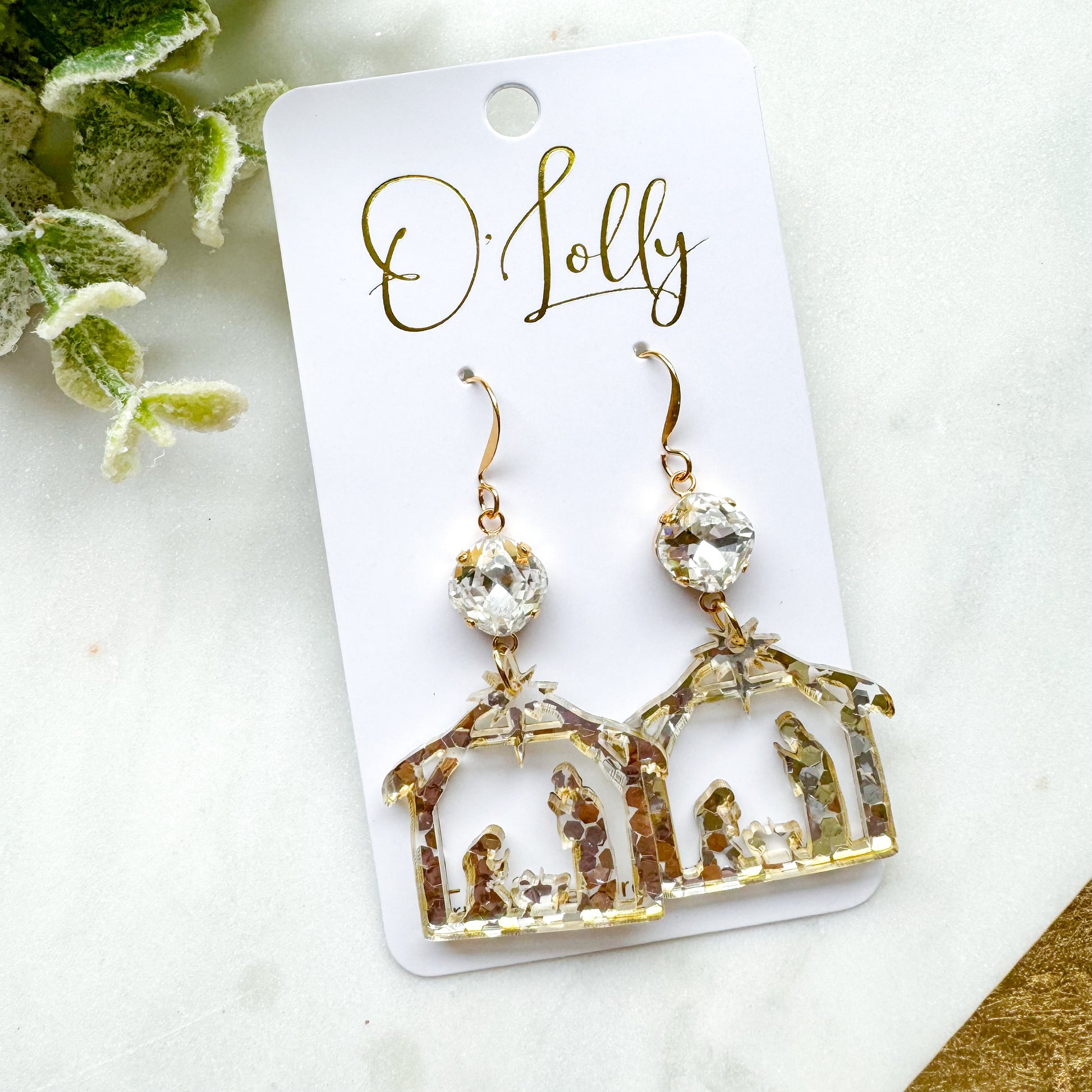 O’Lolly “Manger” Earrings- Clear Stone w/Gold Acrylic Christmas Manger