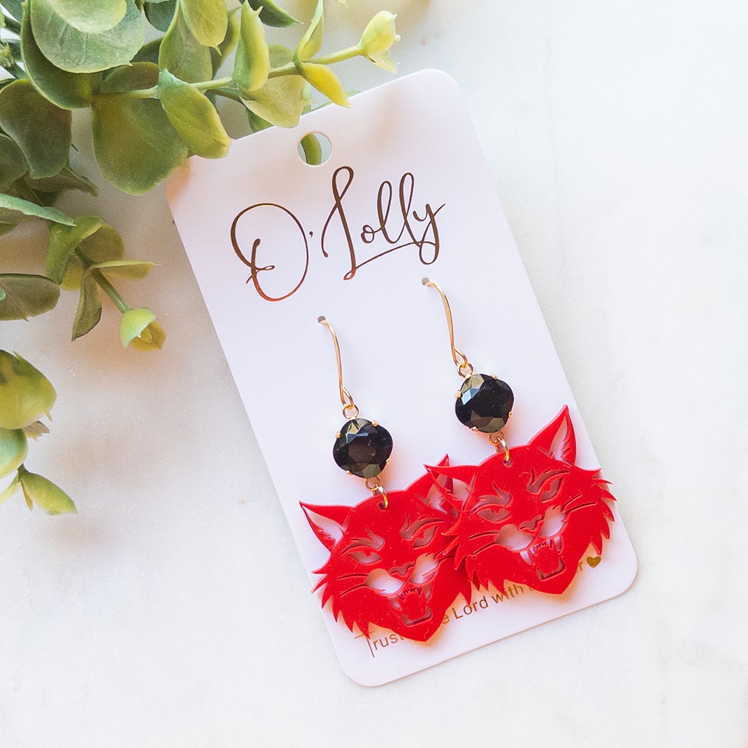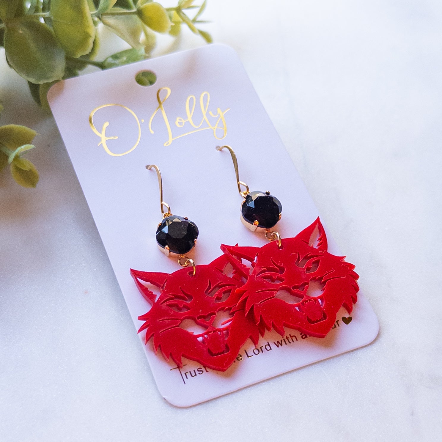 Show your passion for the Sebastopol Bobcats with these red bobcat earrings featuring a striking black stone. Perfect for showing your team spirit at football games, these earrings are 2.5 inches long.