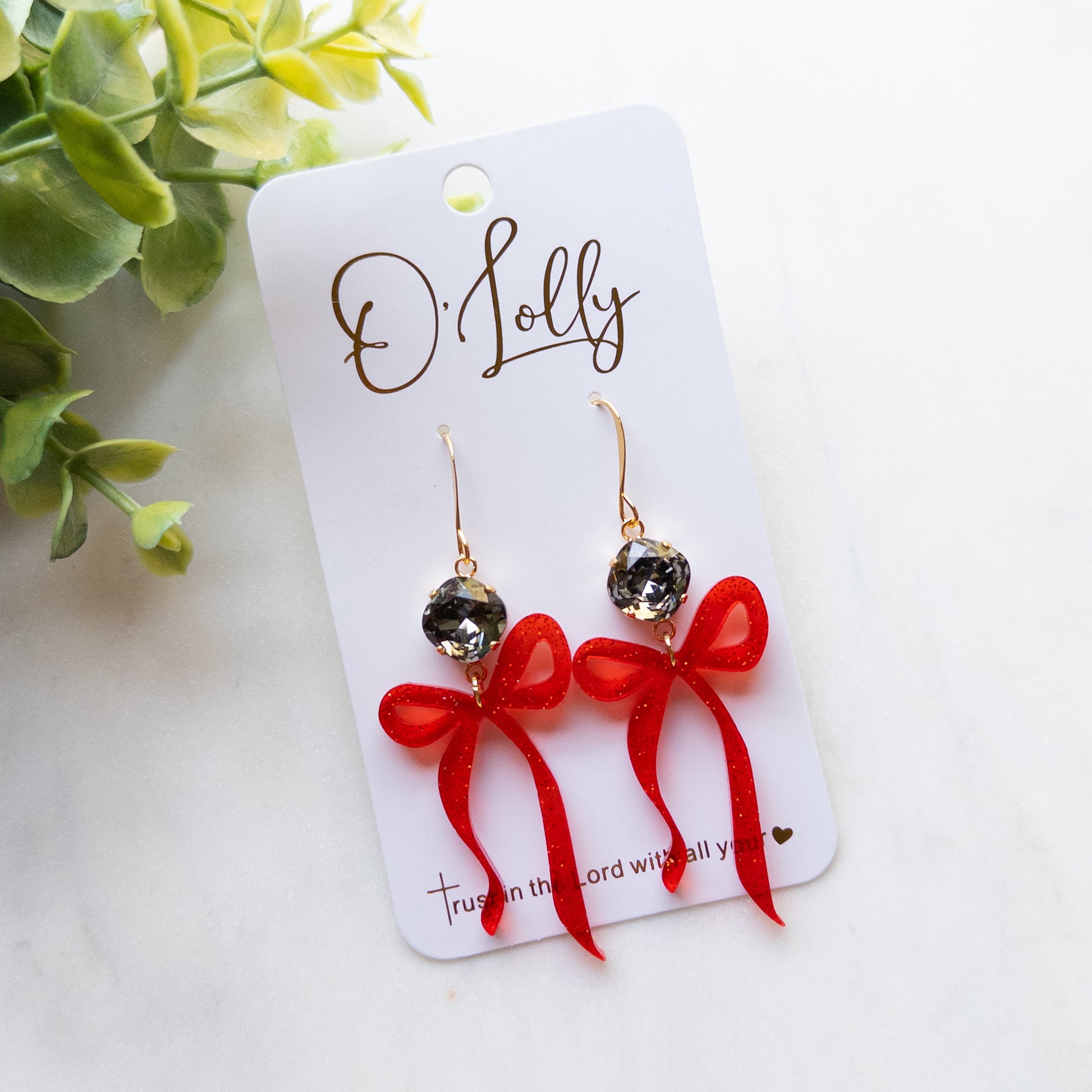 Red Glitter Acrylic Bow Earrings w/Charcoal Stone