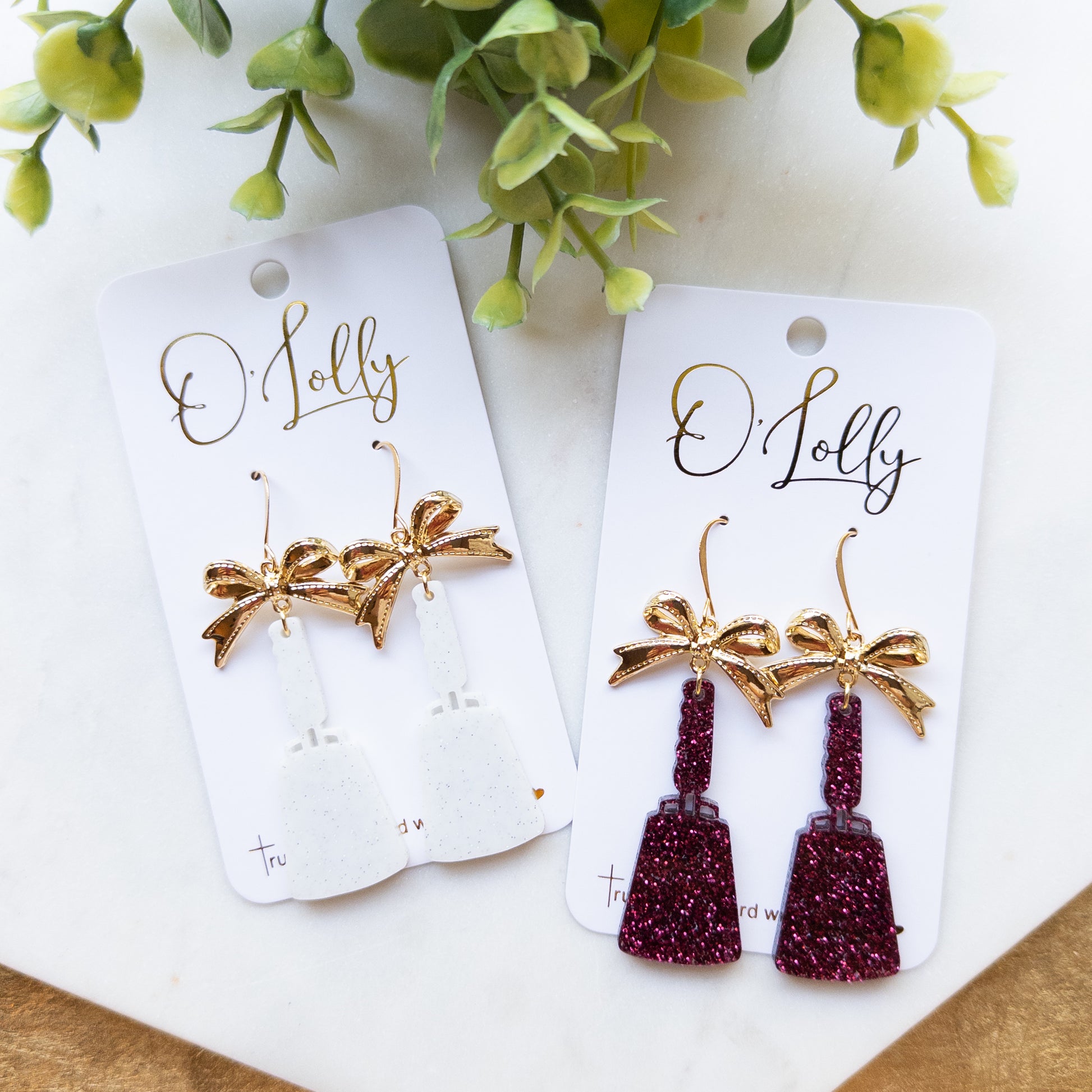 White or Maroon Acrylic Glitter Cowbell w/Gold Bow